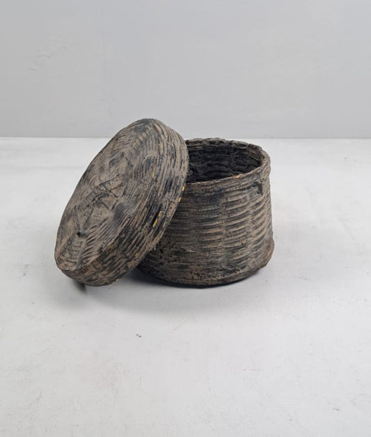 Bereits vergebenBhutanischer Korb mit Deckel aus Weide und Ton - S