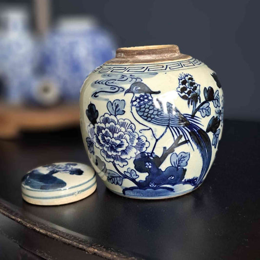 Bereits vergebenAntike chinesische blau-weiße Teeblatt-Vase mit Deckel, Ingwerdose